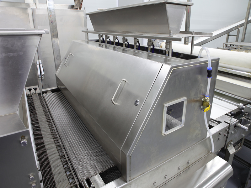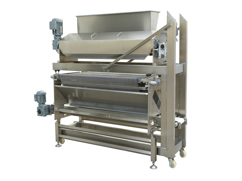 該設備應用于將固體顆?;蛘叻蹱钫{味料,鹽,糖,芝麻及果仁片等撒布在面皮或則餅干上。回收機回收多余的撒布物料循環利用。